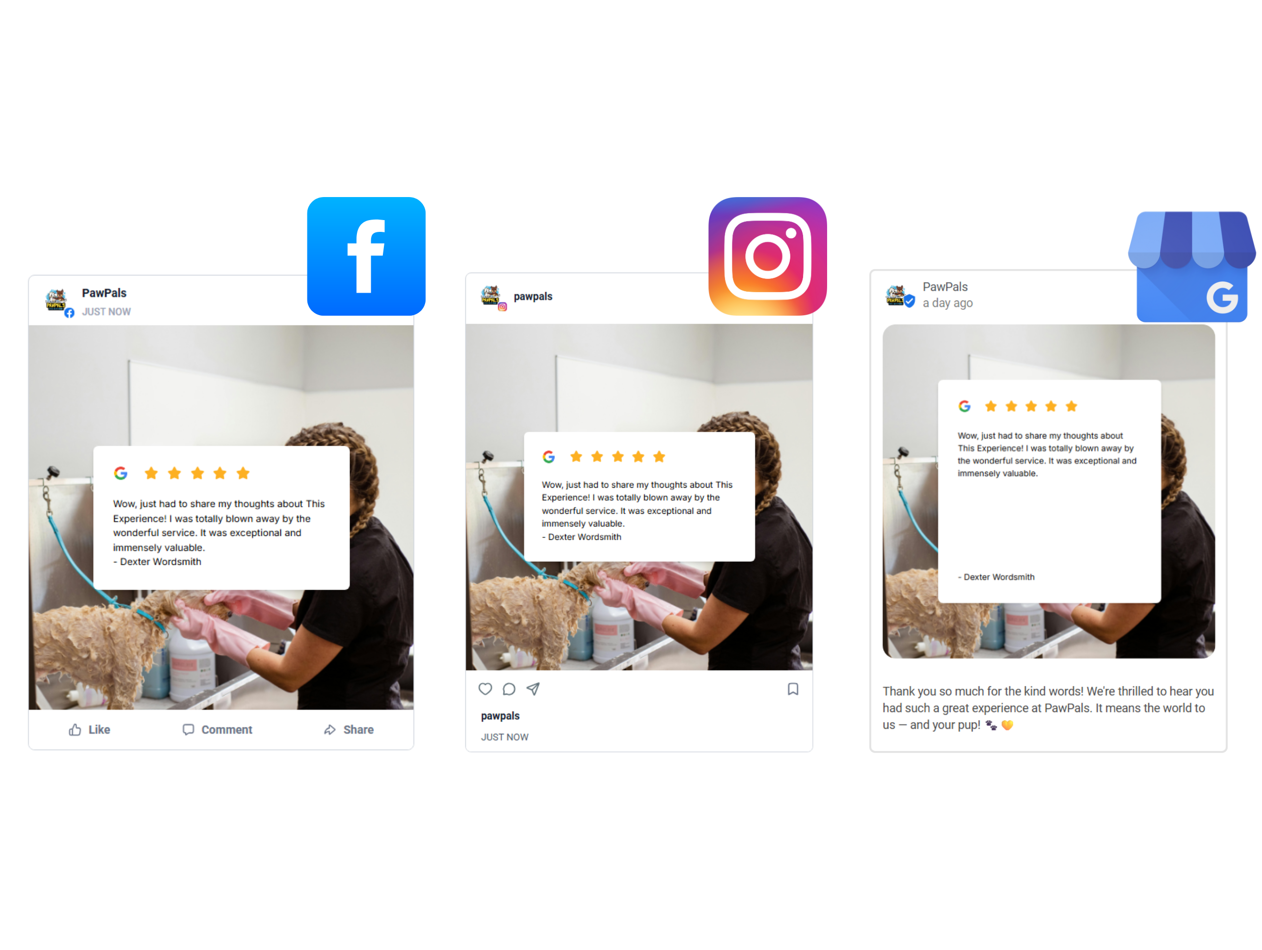 We will automate posting your 5 star reviews to all of your social media platforms.